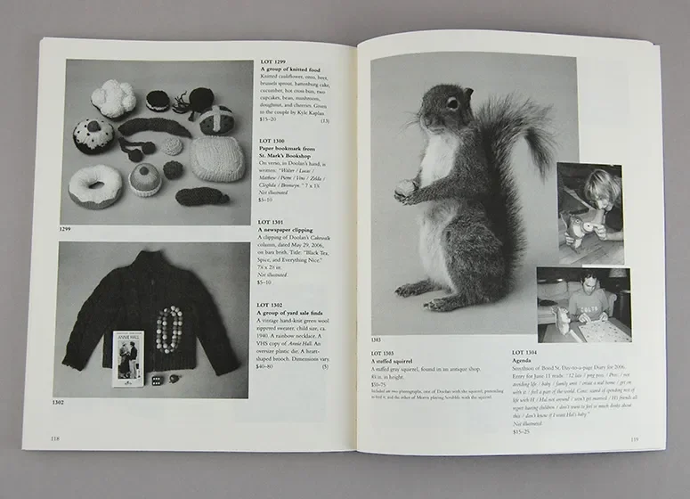 Lots 1299-1304 in Leanne Shapton’s Important Artefacts, pp. 118-19. In addition to the stuffed squirrel are a group of yard sale finds, a newspaper clipping, paper bookmarks, a selection of knitted food, and a diary, with the admission ‘I don’t know if I want Hal’s baby’. Image source: https://clarelmarks.wordpress.com/2015/12/11/important-artifacts-and-personal-property-from-the-collection-of-lenore-doolan-and-harold-morris-including-books-street-fashion-and-jewelry/